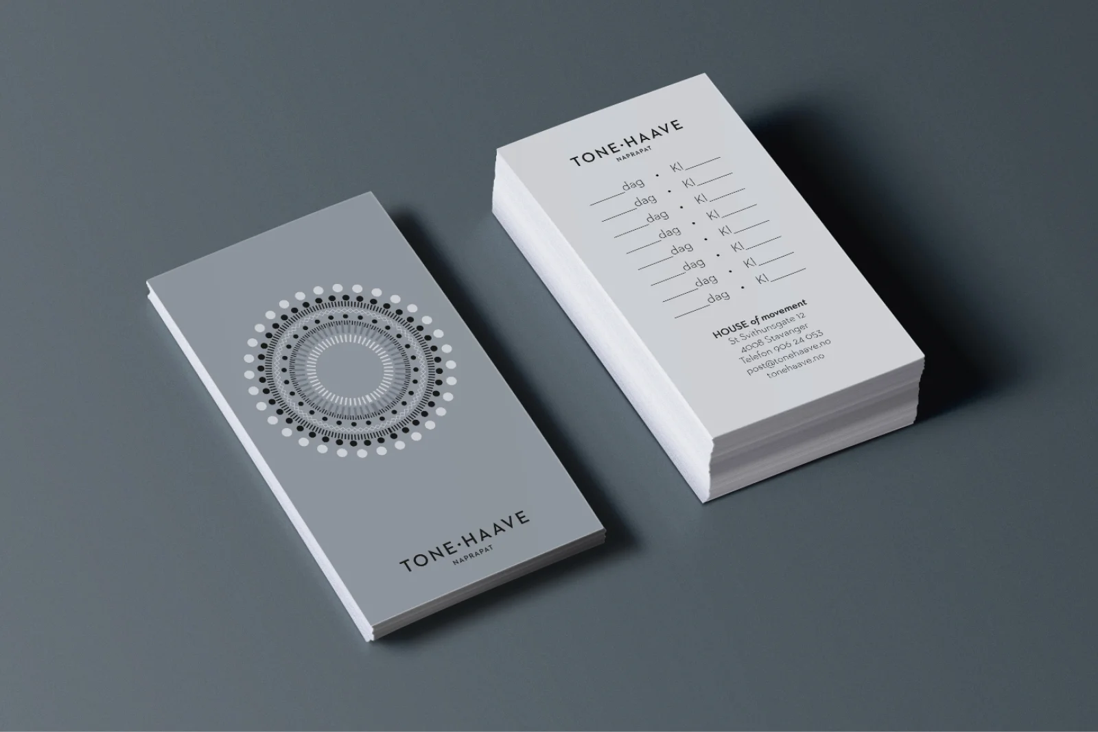 Naprapati handler om å finne årsak til smerte og sette sammen behandling som fungerer for hver enkelt. Tone Haave er en av Stavangers mest erfarne innen faget og ønsket en tydelig visuell profil. Jeg utviklet en logo og grafisk identitet som reflekterer det Tone fokuserer knallhard på: helhet, forandring og bevegelse. Resultatet er en visuell identitet som er ren og avbalansert, og som skaper trygghet for Tones lange erfaring og kompetanse.
